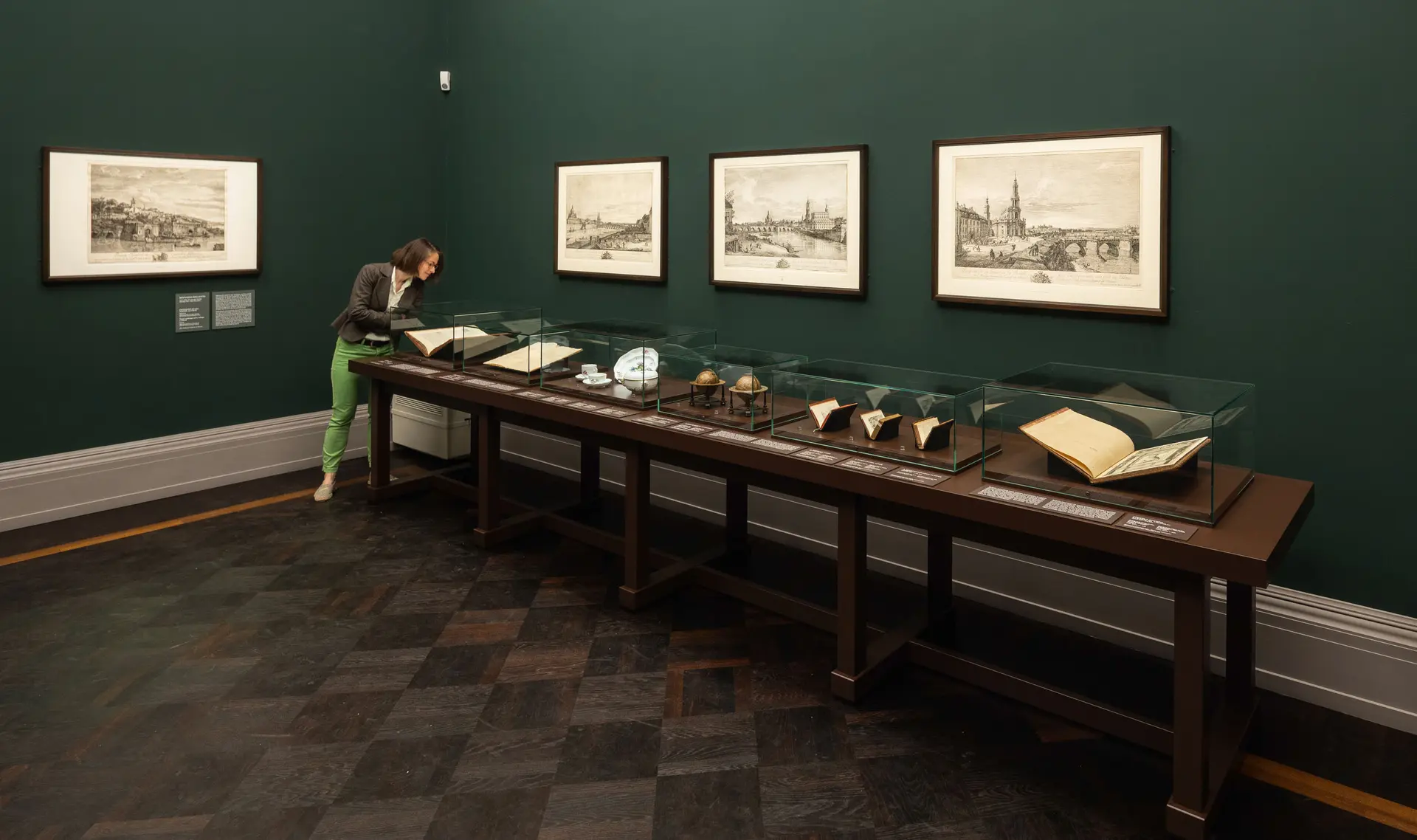 Eine ganze Reihe von eigenhändigen Radierungen stellen Bellotto als Grafiker und Unternehmerpersönlichkeit vor. Sie sind zu Gast aus dem Kupferstich-Kabinett, wo das grafische Œuvre des Künstlers in außergewöhnlicher Vollständigkeit vorhanden ist. Gemeinsam mit Zeichnungen aus Warschau und Darmstadt und in der Gesamtschau mit den Gemälden zeigt sich die ganze Bandbreite von Bellottos Innovationskraft. Bücher, Porzellane, Skulpturen und wissenschaftlichen Instrumente lassen eine eindrucksvolle Vorstellung einer Epoche entstehen, die Bellotto künstlerisch mitgestaltet hat.